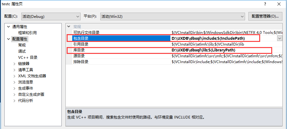 右键“项目”=>“属性”=>“配置属性”=>“VC++目录”,分别选择包含目录和库目录,进行编辑,分别添加uxdb\dbsql下的include目录和lib目录(编辑目录时勾选从父级或项目默认设置继承,目录根据实际路径编辑)。