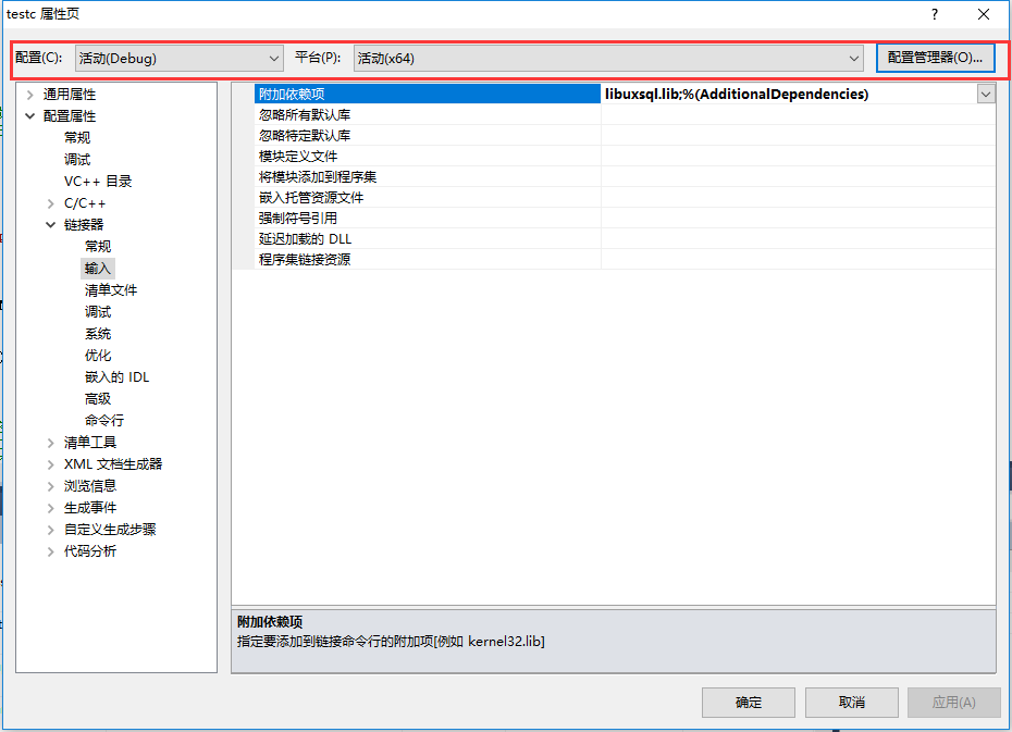 右键“项目”=>“属性”=>“配置属性”=>“链接器”=>“输入”,编辑附加依赖项,输入libuxsql.lib,单击确定。