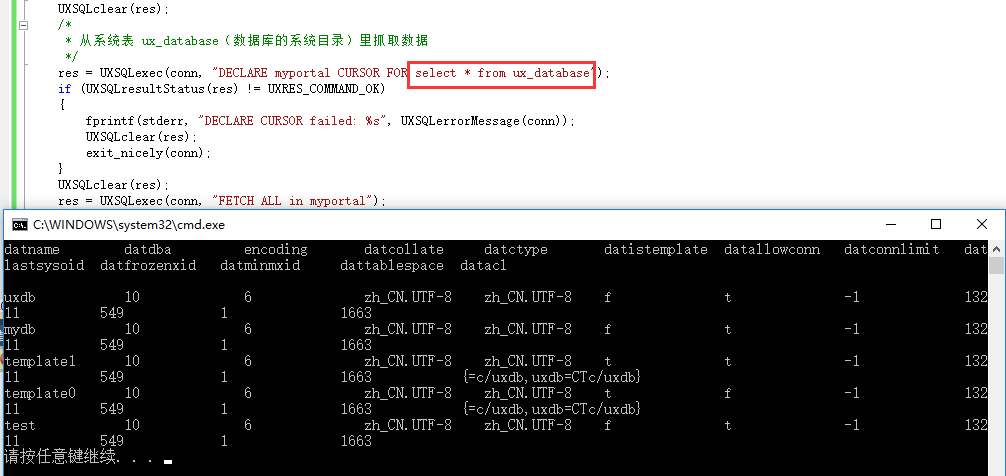 以下通过一个简单的示例来介绍C++客户端程序通过libuxsql库访问UXDB实例的方法和步骤。