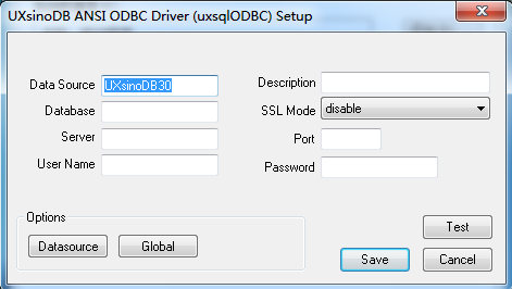 在ODBC驱动器程序列表中,选择【UXsinoDB ANSI】或【UXsinoDB Unicode】,单击【完成】按钮,系统弹出【UXsinoDB ANSI/Unicode Driver (uxsqlODBC) Setup】对话框。