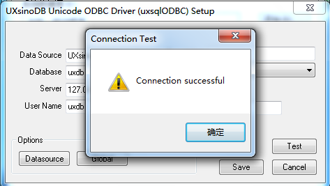 单击【Test】按钮可验证数据库连接状态,成功如下所示,确定后单击【Save】保存。